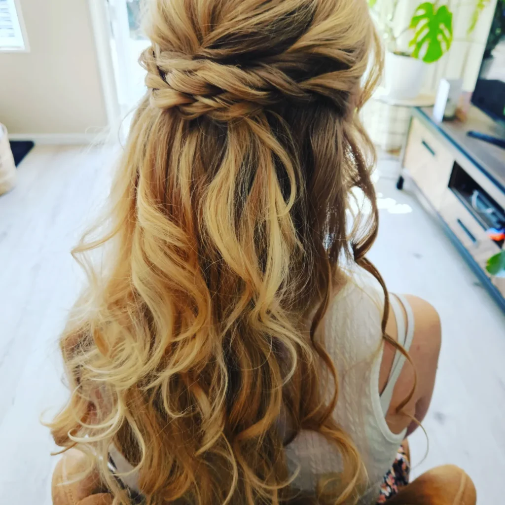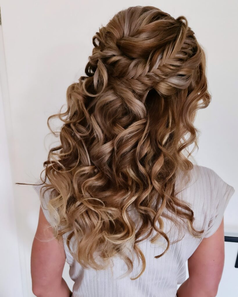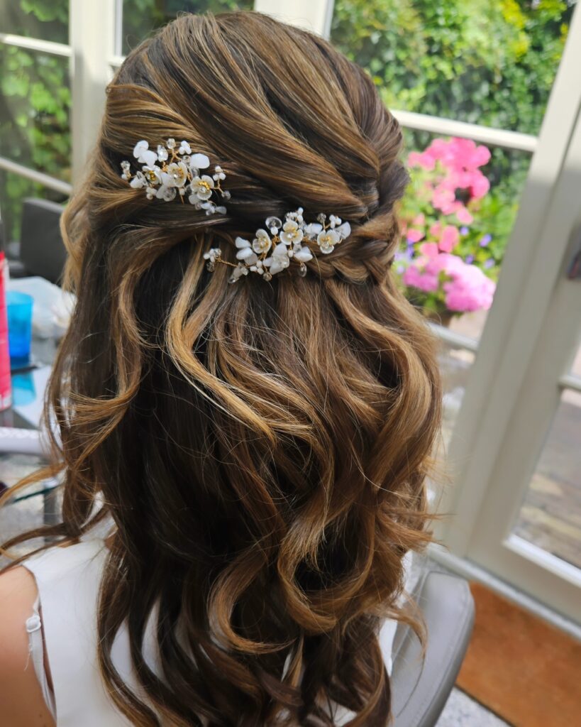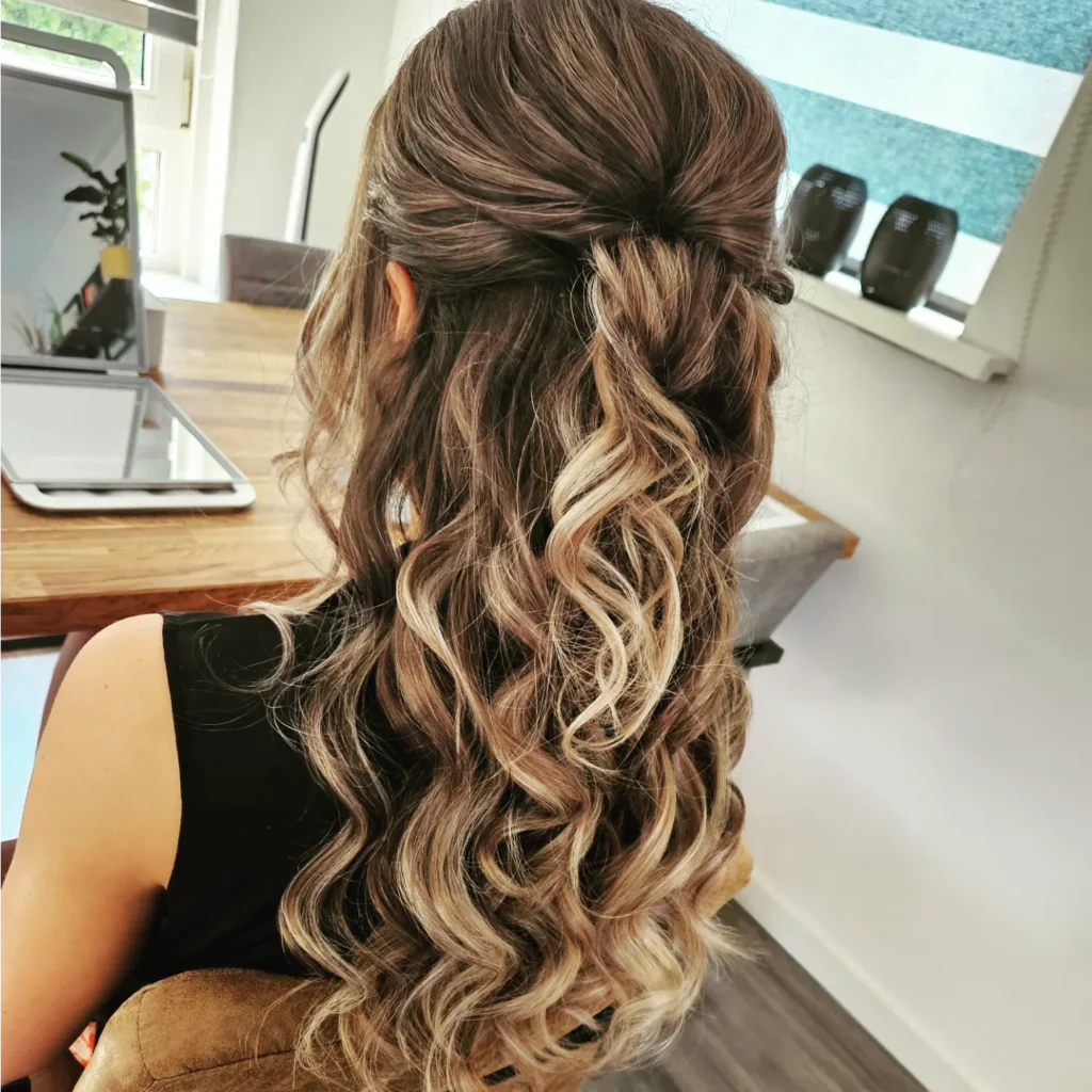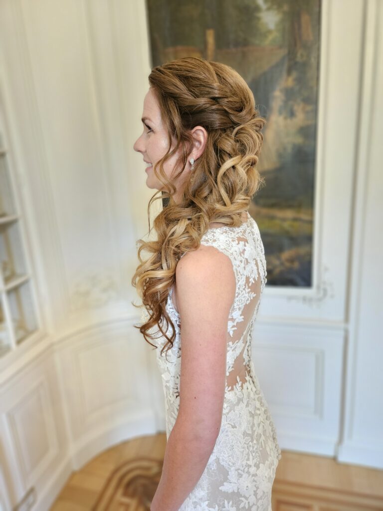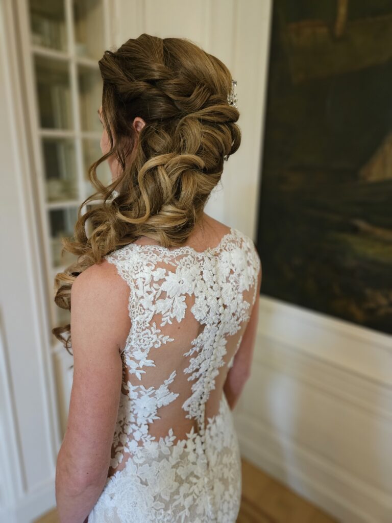 Bij een half opgestoken kapsel wordt een deel van het haar vastgezet, terwijl de rest losjes langs de schouders of rug valt. Dit geeft het gezicht een open en verzorgde uitstraling, terwijl de lengte van het haar speels en natuurlijk blijft. Het kapsel kan worden uitgevoerd met zachte krullen, golvende lokken of glad en strak gestyled haar. Hierdoor is het een veelzijdige optie die zowel bij een klassieke als bij een moderne bruiloft past.