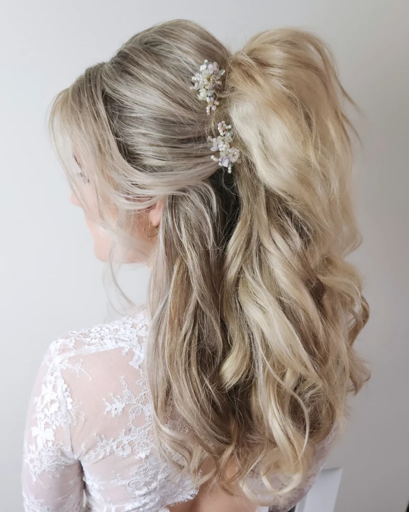 Naast de esthetische voordelen is een half opgestoken bruidskapsel ook praktisch. Het blijft meestal goed in model gedurende de hele dag, van ceremonie tot feest, waardoor je zonder zorgen kunt genieten.