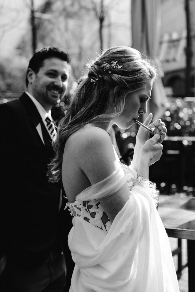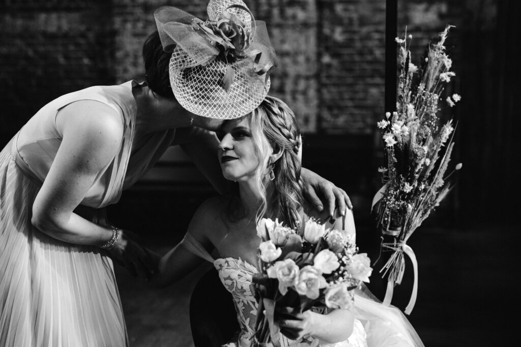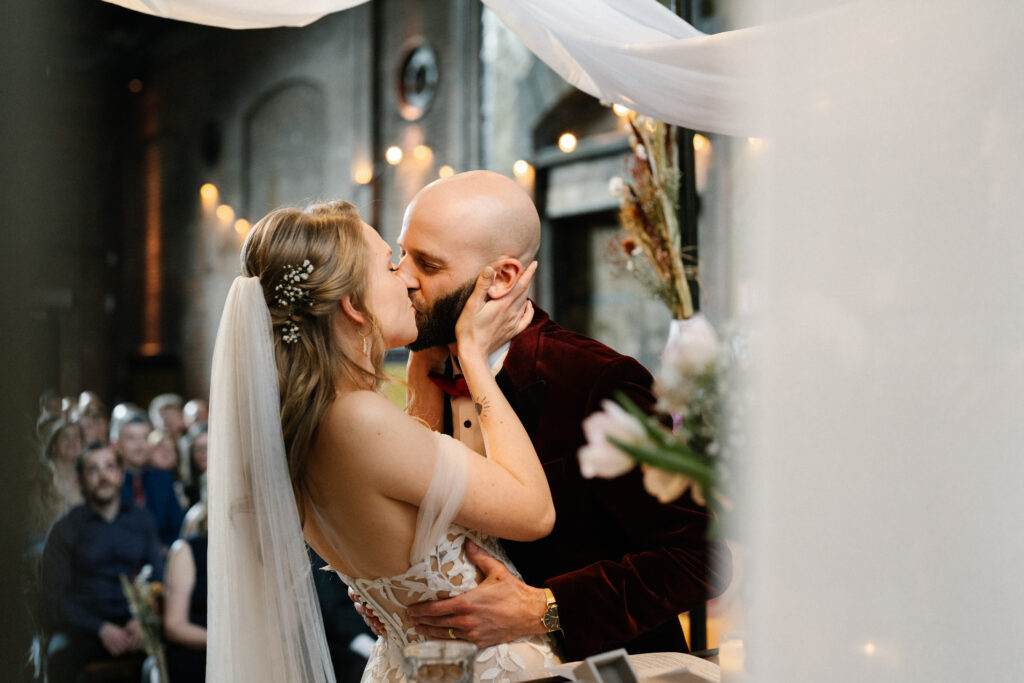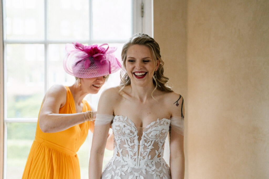 De sluier zorgde voor de finishing touch. Hij benadrukte de klassieke kant van haar bruidslook, terwijl het half los haar voor zachtheid zorgde. Samen vormden ze een stijl die zowel elegant als comfortabel was.