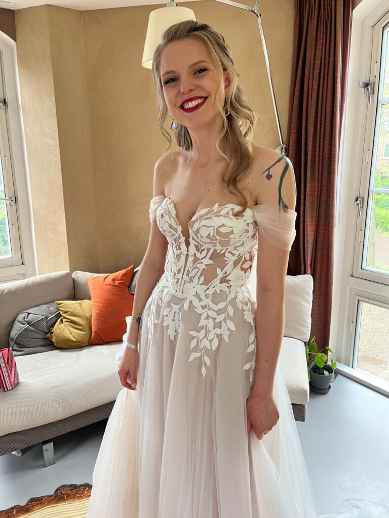 Deze look liet haar stralen, zowel tijdens de ceremonie als het feest. Precies zoals iedere bruid haar grote dag wil beleven.