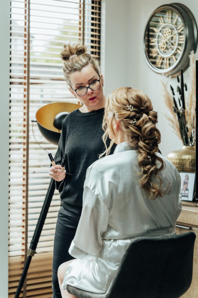 Het kapsel combineert perfect met accessoires zoals bloemen, een subtiele haarspeld of een sluier. Bij Bianca lieten we het minimalistisch, zodat de vlecht volledig tot zijn recht kwam. Zo bleef het geheel fris en tijdloos, passend bij haar stijl en trouwjurk.