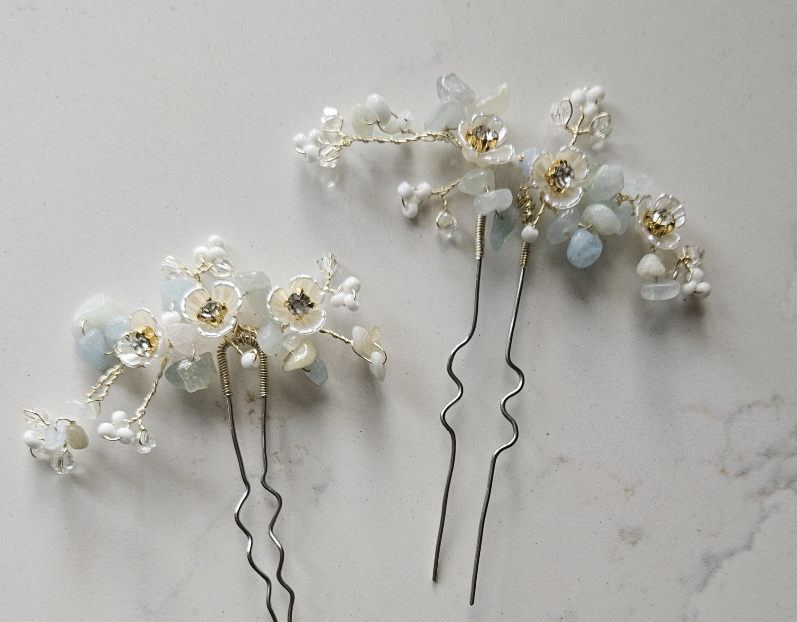 Voeg een vleugje elegantie toe aan je bruidskapsel met deze handgemaakte bruidshaaraccessoire. De witte en lichtblauwe natuursteentjes in zilverdraad zorgen voor een romantische uitstraling. Ideaal voor zowel klassieke als bohemian bruidslooks en een blijvende herinnering aan jouw mooiste dag. Deze set is ook verkrijgbaar in wit met goud, jade en roze.
